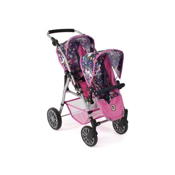 Poussette double poupees multi-positions Tissu Licornes Rose - 63x43x77cm - Poignee reglable 50-82cm - Set landau poupon + carte