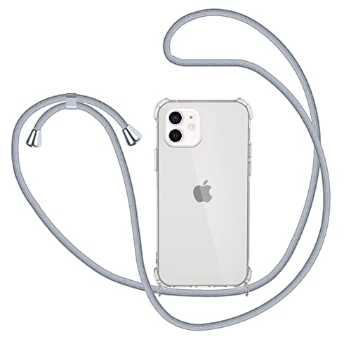 XTCASE Collier pour iPhone 12 / iPhone 12 Pro Coque, Etui de Téléphone avec Cordon - Tour de Cou Lanière en Corde - Transparente Silicone Housse avec Cordage Lanyard Case, Gris
