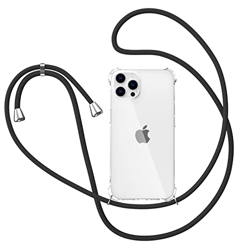 XTCASE Collier pour iPhone 12 Pro Max Coque, Etui de Téléphone avec Cordon - Tour de Cou Lanière en Corde - Transparente Silicone Housse avec Cordage Lanyard Case, Noir