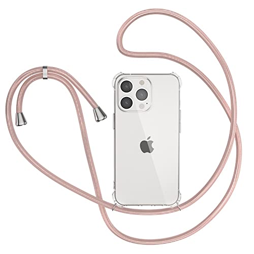 XTCASE Collier pour iPhone 13 Pro Max Coque, Etui de Téléphone avec Cordon - Tour de Cou Lanière en Corde - Transparente Silicone Housse avec Cordage Lanyard Case, Or Rose