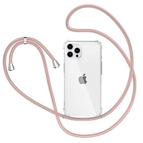 XTCASE Collier pour iPhone 12 Pro Max Coque, Etui de Téléphone avec Cordon - Tour de Cou Lanière en Corde - Transparente Silicone Housse avec Cordage Lanyard Case, Or Rose