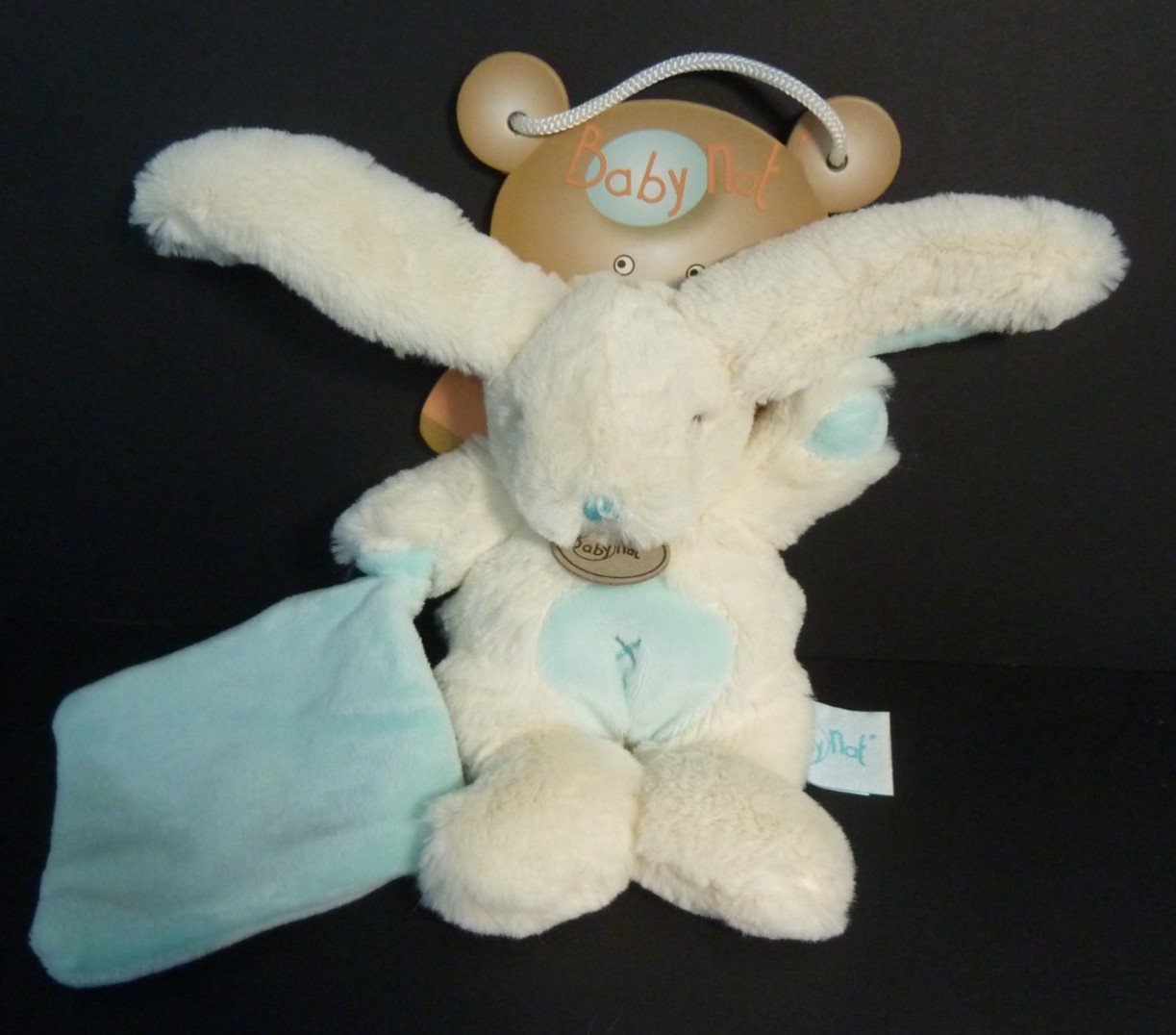 SE. Doudou BABY NAT LES CALINS LAPIN blanc mouchoir bleu 19cm BN743 100% NEUF