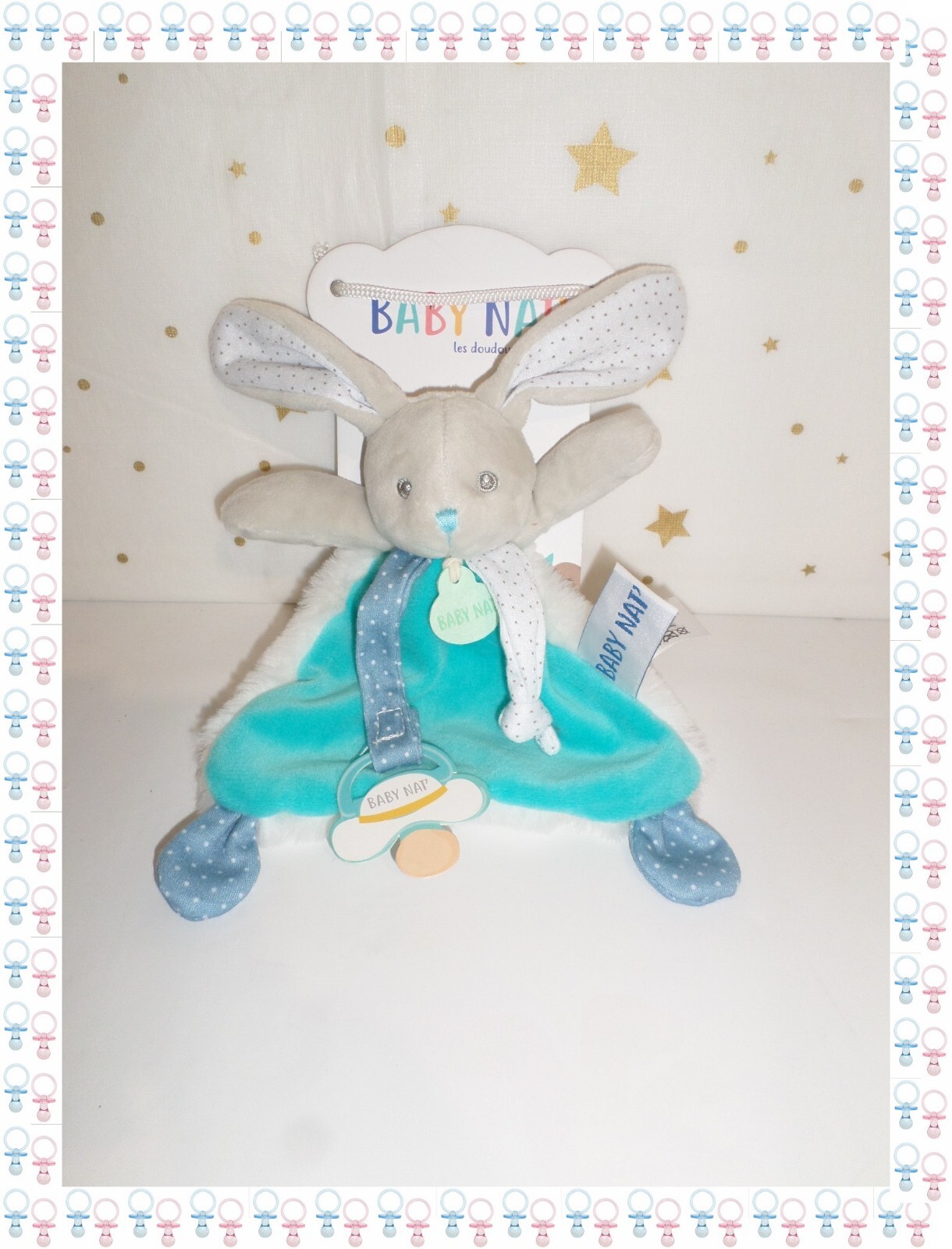 ㉔ - Doudou Attache Sucette Lapin Poupi Bleu Vert Gris Baby Nat