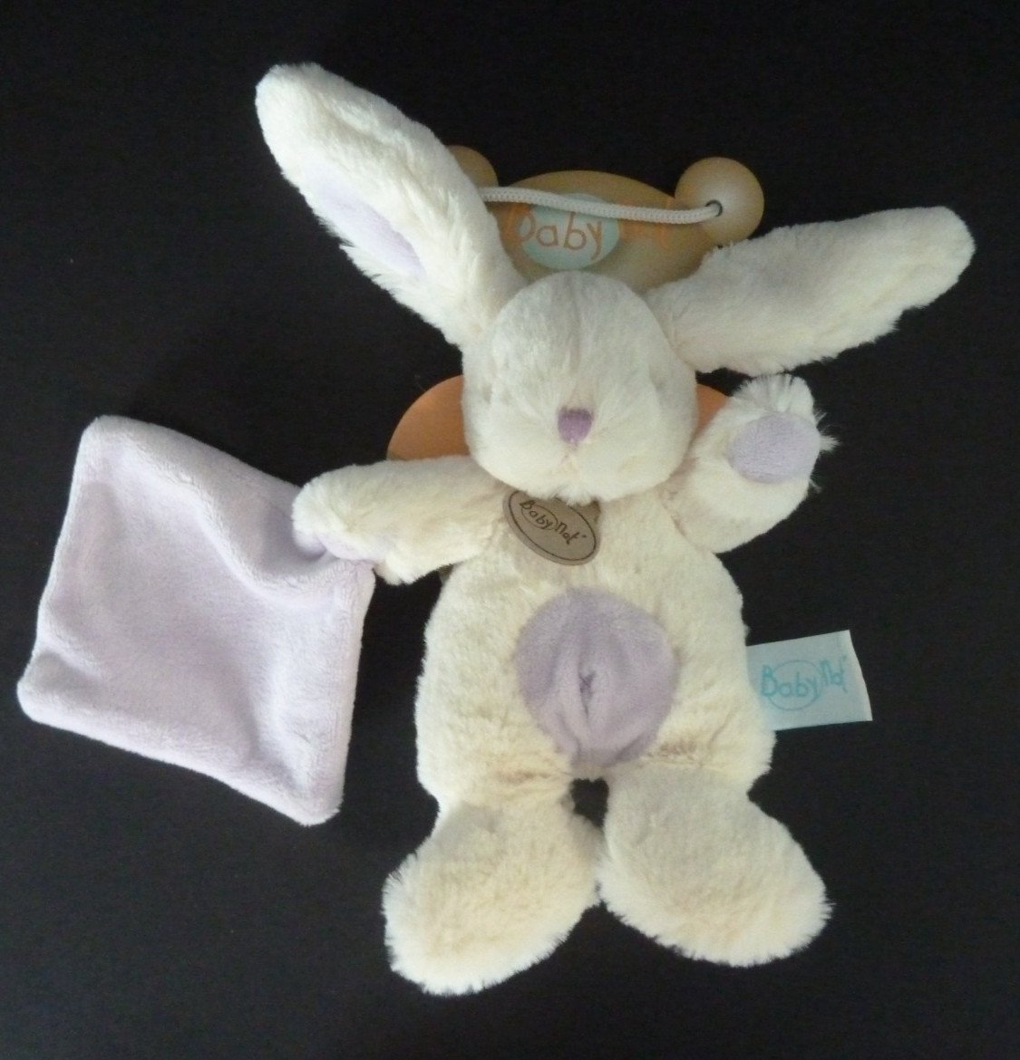 SE. DOUDOU BABY NAT LES CALINS LAPIN blanc mouchoir mauve croix 19cm 100% NEUF