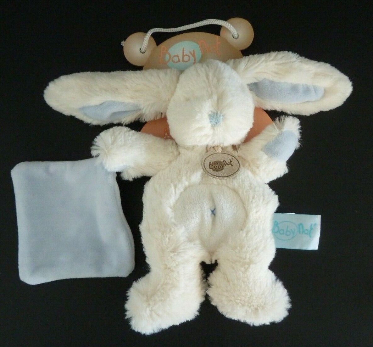 Ni1. DOUDOU BABY NAT LES CALINS LAPIN BLANC MOUCHOIR BLEU CROIX 19cm 100% NEUF*