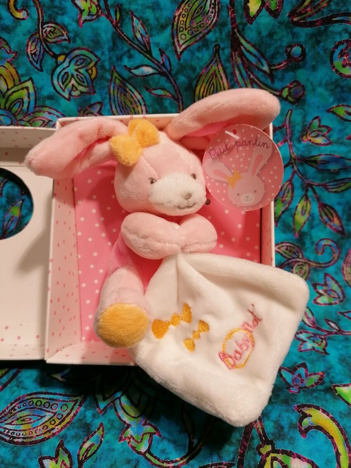⭐⭐⭐Doudou Petit pantin Lapin rose jaune mouchoir BABYNAT éclats de rire ⭐⭐NEUF