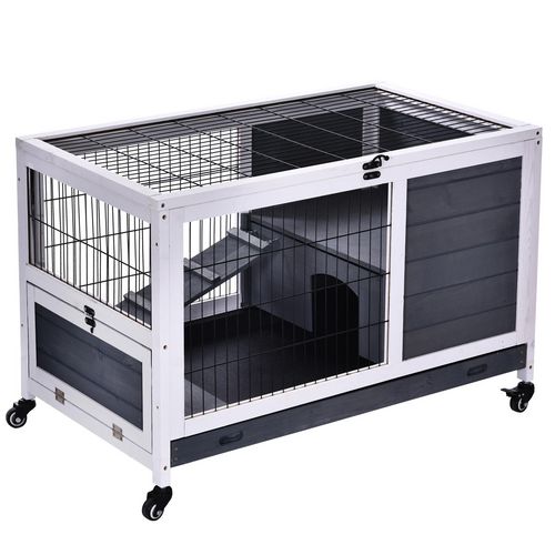Clapier à lapin sur roulettes cage à lapin 2 étages porte verrouillable toit ouvrant plateau coulissant rampe bois de sapin gris blanc