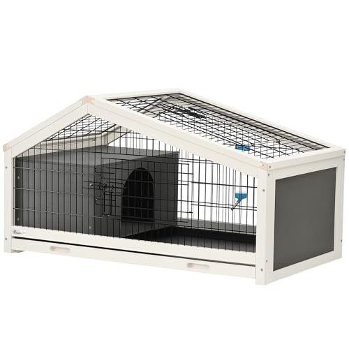 PawHut Clapier Cage à Lapin - Cage à Lapin intérieur Niche, Plateau déjection, Porte et Toit ouvrant verrouillables, Abreuvoir - Acier Noir Sapin Gris Blanc