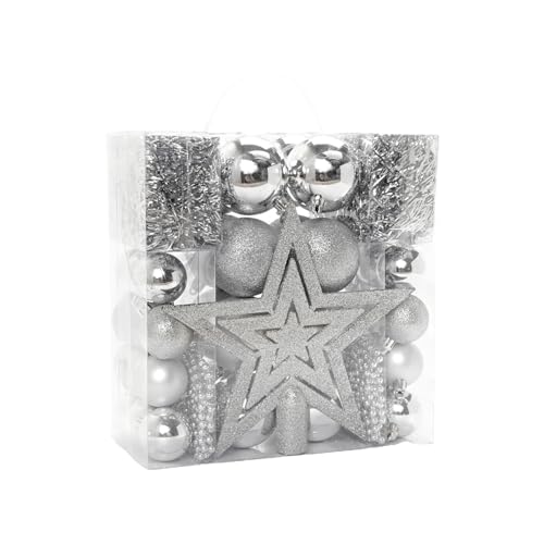 Heitmann Deco Kit de décoration, pour l'arbre de Noël, Argent, 45 pièces, avec cimier de Sapin, Boules, chaînes de Perles et guirlandes, en Plastique.