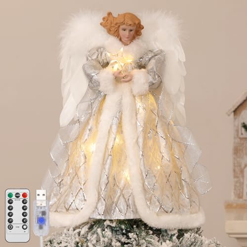 Lewondr Ange de la Cime du Sapin de Noël, 12 Pouces Cimier d'arbre de Noël Ange avec 8 Lumières, Figurine d'ange avec Ailes, Décoration de l'arbre de Noël avec Minuterie 6H pour la Maison, Argent