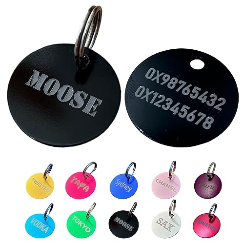 UNIKTAG Médaille gravée pour chien ou chat, médaillon personnalisable rond, 10 coloris, 18 polices de caractères, aluminium. Gravure laser en France (Noir)