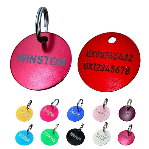 UNIKTAG Médaille gravée pour chien ou chat, médaillon personnalisable rond, 10 coloris, 18 polices de caractères, aluminium. Gravure laser en France (Rouge)