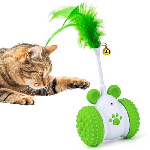 Mcbazel Voiture Jouet Automatique pour Chat Interactive avec Plumes et Laser, Clochette, Roues Massantes Rotatives à 360°, Matériaux ABS/Silicium Sûrs – Vert