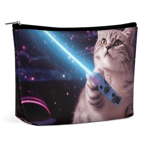 LYHVSFJW Trousse de maquillage portable pour femme, trousse de maquillage en alpaga nuit étoilée, trousse de toilette de voyage pour accessoires de voyage, Chat fantaisie au laser spatial, Taille
