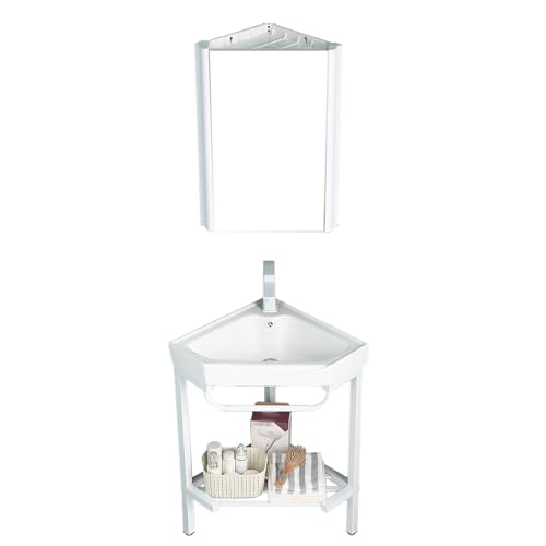 Aioneer Ensemble Lavabo d'angle Et Meuble-Lavabo, Support en Acier Inoxydable, Lavabo en Céramique, Lavabo Utilitaire sur Pied, Meuble avec Miroir, Robinetterie, Accessoires, Pou-Set 2-47cm/18.5in
