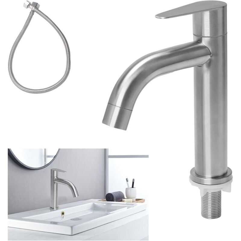 Robinet Eau Froide Acier Inoxydable, Robinet Eau Froide Lave Main avec Tuyau, Mitigeur Lavabo, Robinet Baignoire pour WC Invités, Salle Bain,