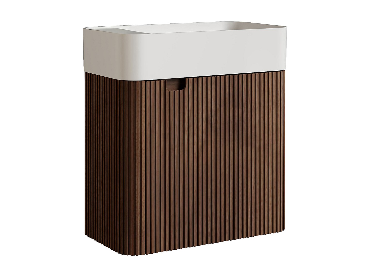 Meuble lave main suspendu strié en bois de frêne avec vasque en résine blanc mat - Naturel foncé - 45 x 25 x 48 cm - JONSA