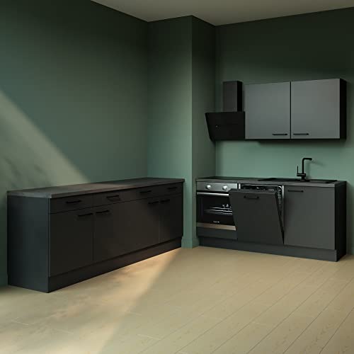 WALLERS Cuisine noire de 180cm de long avec un module complémentaire de 240cm, four encastré, hotte, lave vaisselle, évier et mitigeur, plaque de cuisson de 4 foyers (Plan de travail couleur béton, Évier à droite)