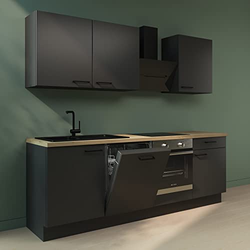 WALLERS Cuisine noire de 240 cm de long, lave-vaisselle intégré, four encastré, hotte, évier et mitigeur, plaque de cuisson 4 foyers (Plan de travail couleur chêne, Évier à droite)