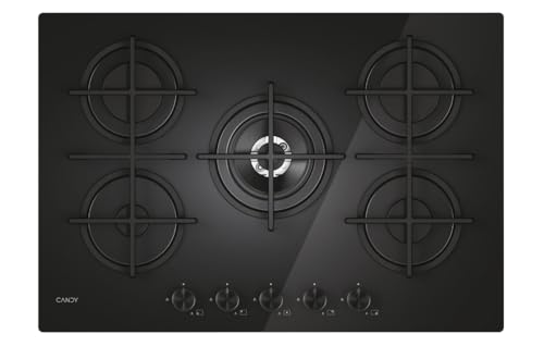 Candy Moderna Gas On Glass Plaque de cuisson à gaz 5 feux, verre trempé, brûleur à double couronne, grilles lavables au lave-vaisselle, axLxP 0,8 x 74,5 x 51 cm, noir - CVG74WTB