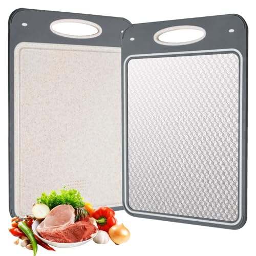 Cozary Planche a Decouper Inox, Planche à Découper Double Face pour La Cuisine 35X24CM, Planches à Découper en Acier Inoxydable 304 et Paille de blé PP, Rainure pour Le Jus, Passe Au Lave-Vaisselle