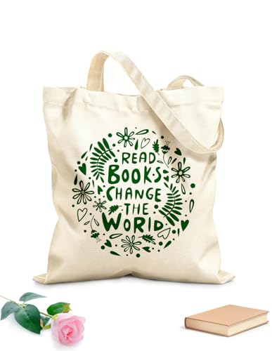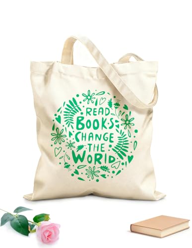 XIARON Sac de courses en toile de coton Lire le livre Changer le monde Librairie Phrase Library tissu épais de 340g/m² Utilise comme sac cadeau L Vert bleuâtre
