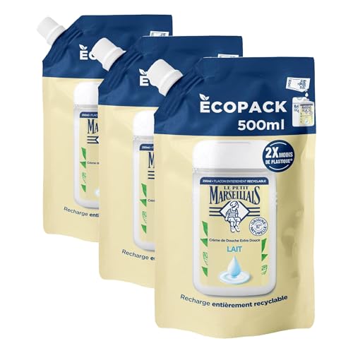 Le Petit Marseillais – Recharge Crème de Douche Extra Douce Lait (écopack de 500 ml) – Gel douche avec 92% d'ingrédients d'origine naturelle – pH neutre pour la peau et sans colorant (Lot de 3)