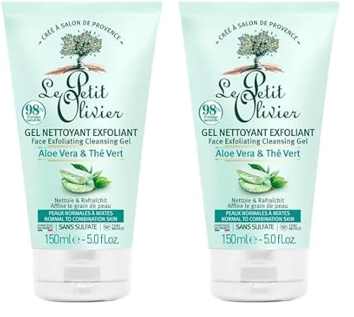 LE PETIT OLIVIER - Gel Nettoyant Purifiant - Aloe Vera & Thé Vert - Nettoie & Rafraîchit - Peaux Normales à Mixtes - 98% D'Origine Naturelle - Sans Sulfate - Fabriqué en France - 150 ml (Lot de 2)