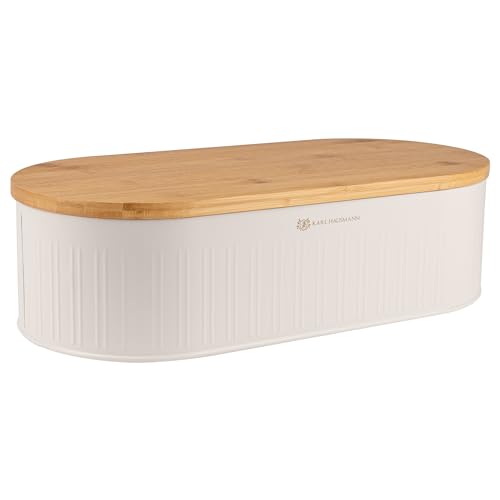 KARL HAUSMANN Boîte à Pain Blanche en Métal avec Couvercle en Bambou - Garde le pain frais plus longtemps | Grande Huche a Pain pour cuisine et plan de travail | 2en1 planche à découper et ventilation