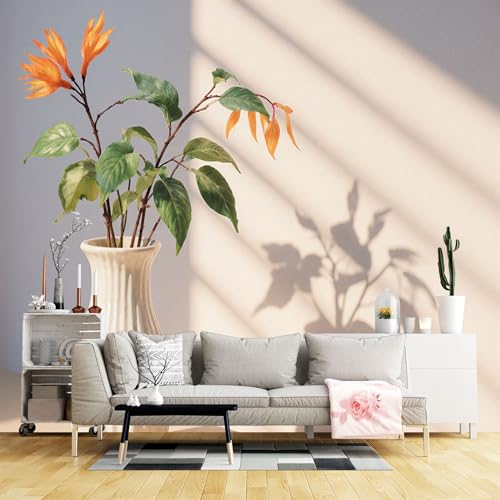 Papier peint mural de taille personnalisée, vase en céramique éclairé par le soleil avec feuilles vertes et oranges, art botanique minimaliste ombre, tissu mural auto-adhésif (sans PVC), grand papier