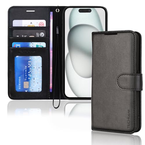 TECHGEAR iPhone 15 Leather Wallet Case, Flip Protective Case Cover with Wallet Card Holder, Stand and Wrist Strap - Black PU Leather with Magnetic Closure for iPhone 15 6.1"