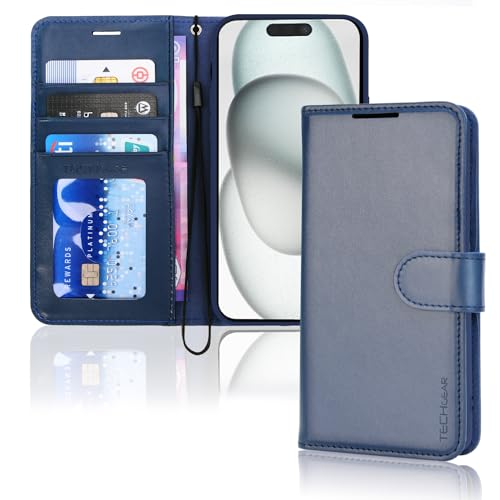 TECHGEAR iPhone 15 Leather Wallet Case, Flip Protective Case Cover with Wallet Card Holder, Stand and Wrist Strap - Blue PU Leather with Magnetic Closure for iPhone 15 6.1"