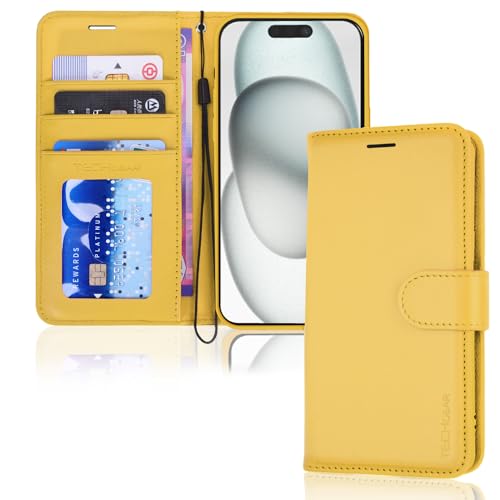 TECHGEAR iPhone 15 Leather Wallet Case, Flip Protective Case Cover with Wallet Card Holder, Stand and Wrist Strap - Yellow PU Leather with Magnetic Closure for iPhone 15 6.1"