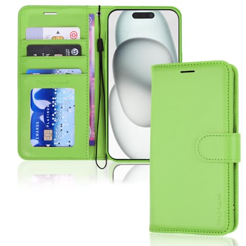 TECHGEAR iPhone 15 Leather Wallet Case, Flip Protective Case Cover with Wallet Card Holder, Stand and Wrist Strap - Green PU Leather with Magnetic Closure for iPhone 15 6.1"