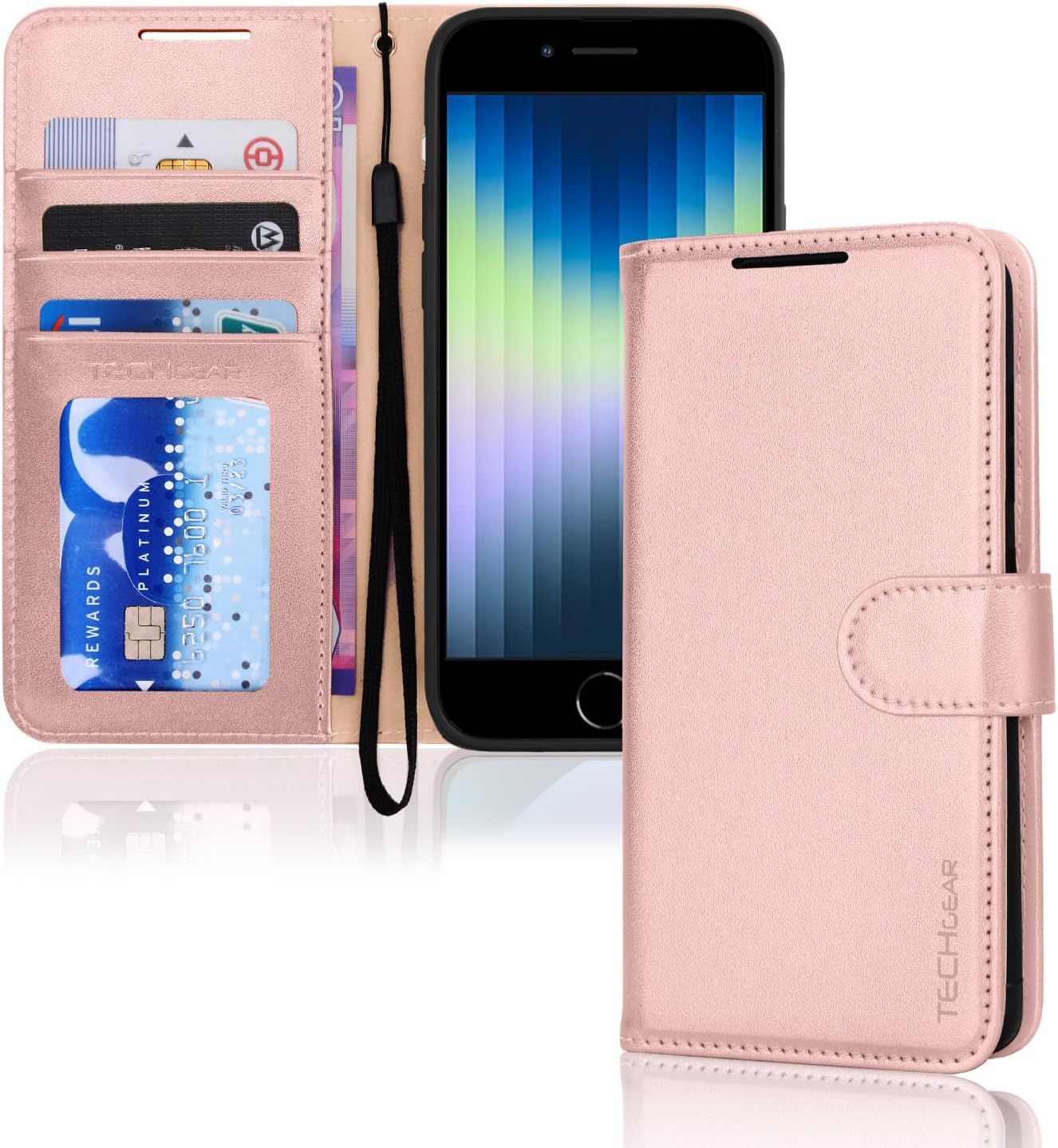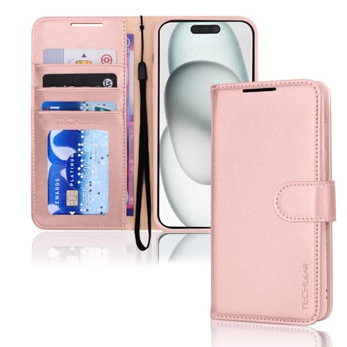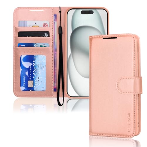 TECHGEAR iPhone 15 Leather Wallet Case, Flip Protective Case Cover with Wallet Card Holder, Stand & Wrist Strap - Rose Gold PU Leather with Magnetic Closure for iPhone 15 6.1"