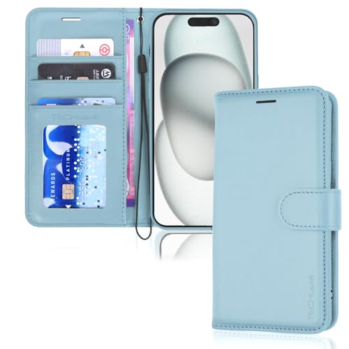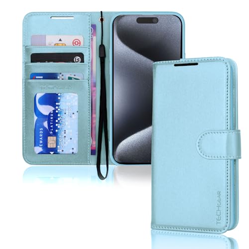 TECHGEAR iPhone 15 Leather Wallet Case, Flip Protective Case Cover with Wallet Card Holder, Stand and Wrist Strap - Light Blue PU Leather with Magnetic Closure for iPhone 15 6.1"