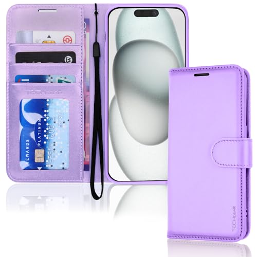 TECHGEAR iPhone 15 Leather Wallet Case, Flip Protective Case Cover with Wallet Card Holder, Stand and Wrist Strap - Purple PU Leather with Magnetic Closure for iPhone 15 6.1"