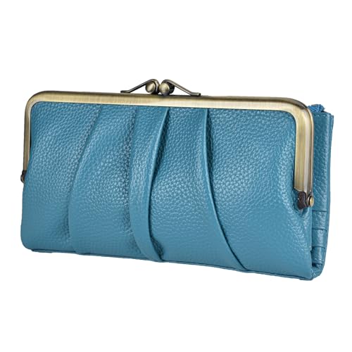 EASTNIGHTS RFID Blocking Wallets for Women Leather Clutch Wallet Bifold Credit Card Holder Ladies Coin Purse with Zipper and Kiss Lock (Blue)