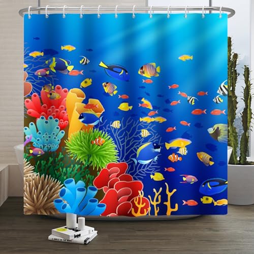 Xiaoterna Rideau de Douche Vie Marine Poisson caricatural Faune Récif corallien Rideau de Salle de Bain Groupe de Poissons tropicaux colorés sous l'eau Rideau de Douche corai 90x180cm