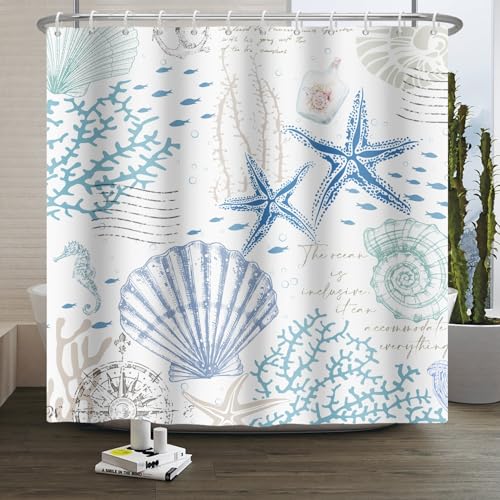 Xiaoterna Été Vie Marine Rideau de Douche Blanc Côte Nautique rétro Étoile de mer Coquillage Corail Hippocampe Rideau de Salle de Bain sous l'eau Décoration de Salle Flore et Faune 120x180cm