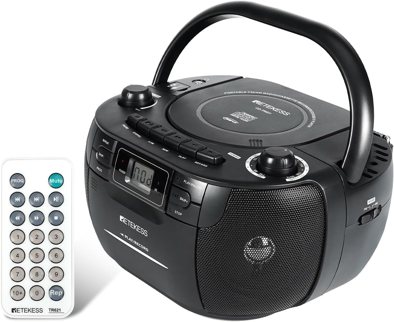 Retekess TR621 Boombox Poste Radio CD,Lecteur Cassette Audio,Boombox Stereo avec Enregistrement,Télécommande,Prise en Charge USB TF Casque,Accompagner Famille et Amis(Noir)