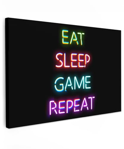 MuchoWow© Impression sur Toile Decoration Murale Peinture 120x80 cm Tableaux Art Décoratif Muraux Décoration Chambre Gaming - Led - Citation - Eat sleep game repeat