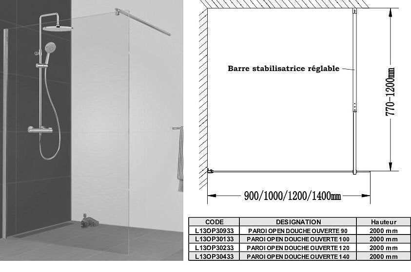 Paroi de douche fixe-barre de stabilisation - verre sérigraphié - Open 2 1200MM LEDA