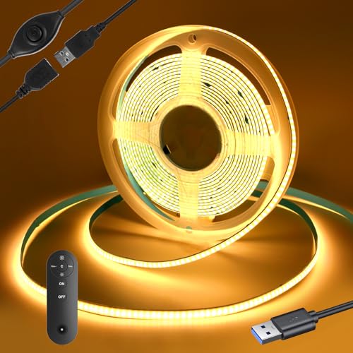 Yamlten Bande LED COB USB de 1 m 5 V (avec contrôleur RF), 3000 K, blanc chaud, 320 LEDs/m, réglable, bande LED pour rétroéclairage de TV, ordinateur, placard, chambre (source d'alimentation)