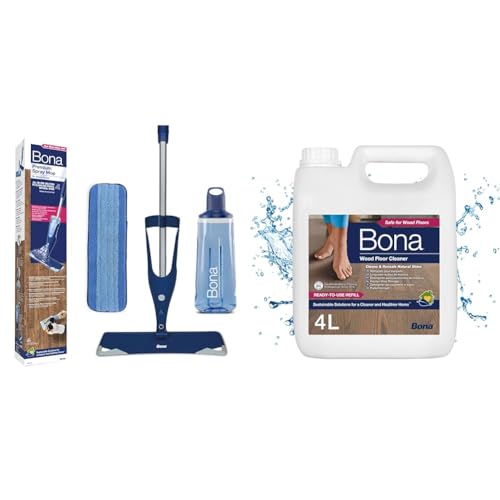 Bona - Balai Spray + 850 ML Nettoyant pour Parquets + 2 Pads en Microfibre - Balai Spray & Nettoyant pour Parquets - 4L - Compatible avec Tous Les Robots Laveurs