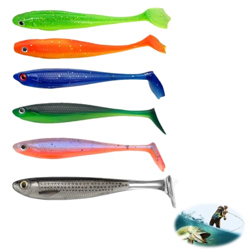 Eulihent Lot de 6 Leurre Peche Carnassier Souple Leurre Peche Mer Kit pour Carpe Brochet Truite Bar Leurres Souples avec T-Tail Articles de Pêche Silicone pour Pêche en Eau Douce et Mer (9cm/12.5g)