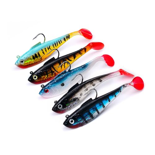 Ksvaye 5 Pièces Leurre Souple Carnassier Leurre Peche Mer Kit pour Carpe Brochet Truite Bar Leurres Souples avec T-Tail Articles de Pêche en Silicone pour Pêche en Eau Douce et en Mer (9CM/12.3g)