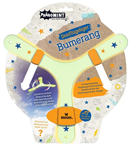 Moses. 30320 PhänoMINT Boomerang Jeu de Lancer pour Enfants, Boomerang Phosphorescent, à Trois Ailes et avec des informations passionnantes, Phosphorescent, 1 pièce (1 pièce)
