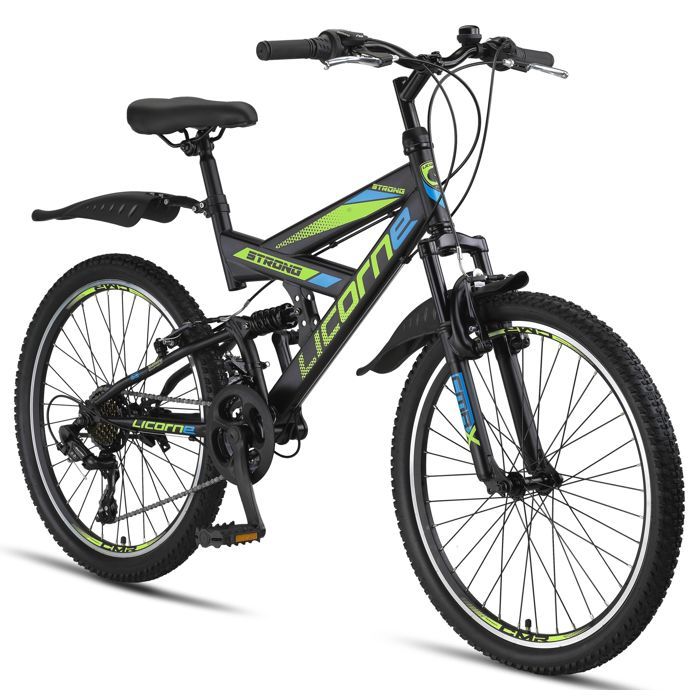 Licorne Bike VTT 26" Premium - Pour Garçons, Filles, Femmes et Hommes - Dérailleur Shimano 21 Vitesses - Suspension Complète - Robuste, Homme, Noir/Bleu/Citron Vert, 24 Pouces