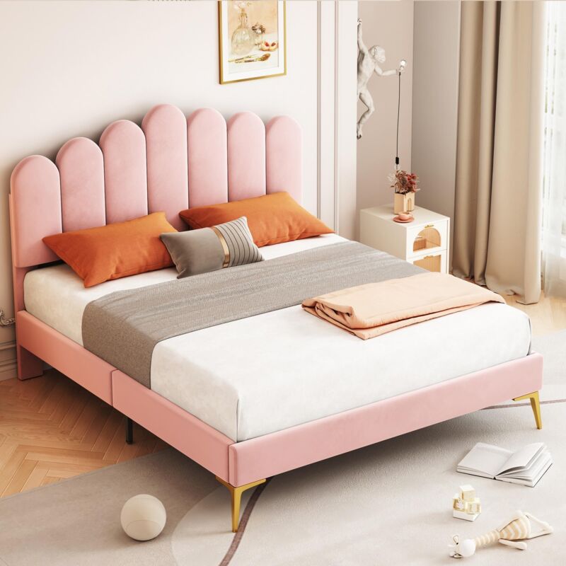 Dans Les Nuages - Lit double capitonné 140x190 cm, tissu velours, avec sommier à latte, tête de lit en forme de fleur, lit adulte style scandinave